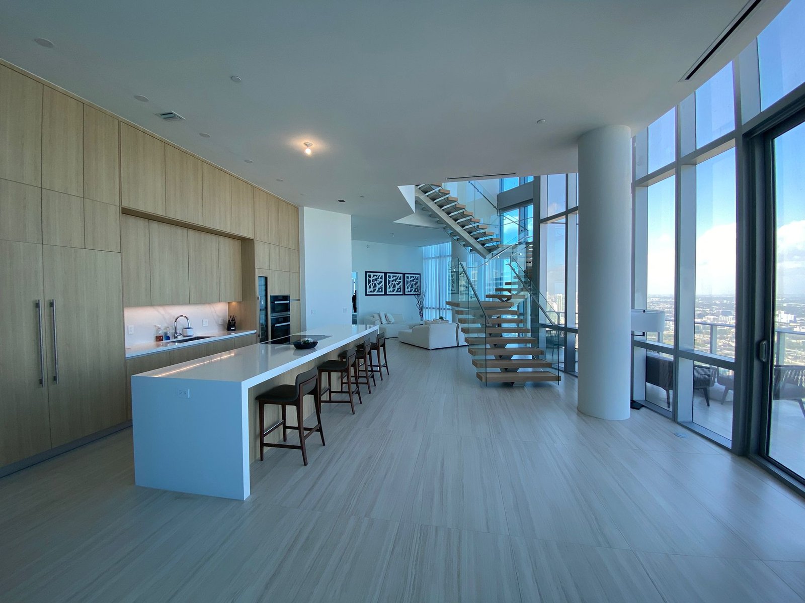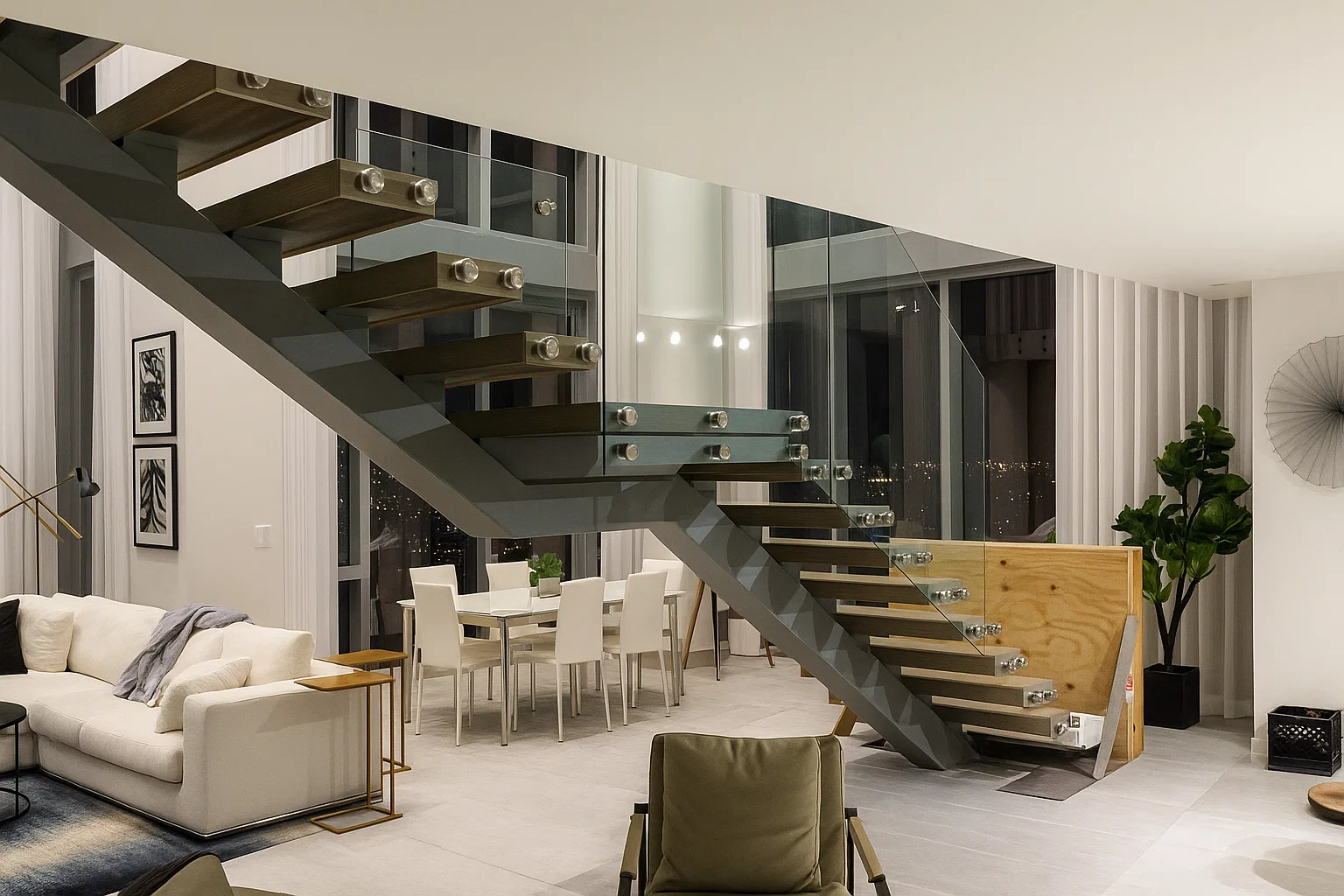 Design and install a custom staircase that serves as the centerpiece for a luxury duplex penthouse.